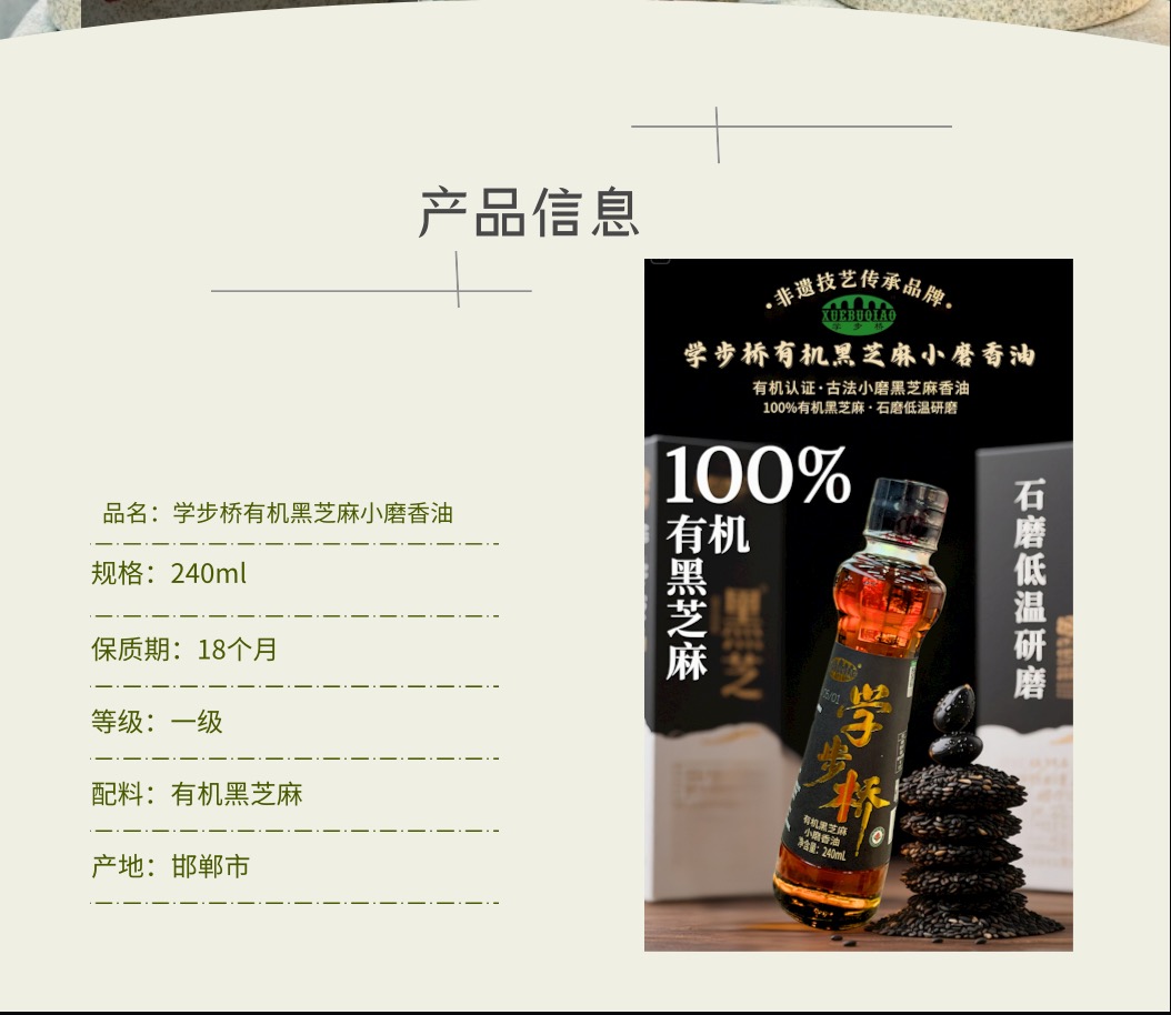 學步橋有機黑芝麻小磨香油,原料精選有機黑芝麻,天然又營養,品質有保障。不含多余添加劑,純芝麻原香。遵循GB/T 8233國家標準,采用傳統水代法工藝,不僅最大程度保留芝麻原香和營養,而且天然純凈、安全健康。質量等級一級,無論是涼拌、熱炒還是做湯,滴上幾滴,香氣四溢,既能享受濃郁芝麻香,又能攝取芝麻中的營養成分,給您的美食增添純正風味!為您的健康再加分!